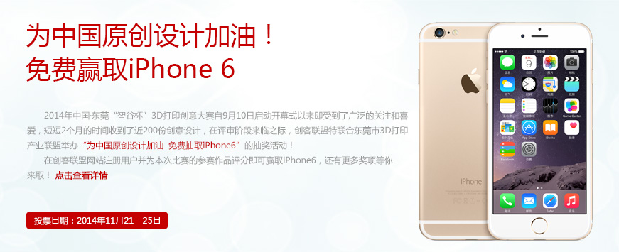 2014年中國?東莞“智谷杯”3D打印創(chuàng)意大賽自9月10日啟動開幕式以來就受到了廣泛的關(guān)注和喜愛,短短2個月的時間收到了近200份創(chuàng)意設(shè)計,在評審階段來臨之際,創(chuàng)客聯(lián)盟特聯(lián)合東莞市3D打印產(chǎn)業(yè)聯(lián)盟舉辦“為中國原創(chuàng)設(shè)計加油 免費抽取iPhone6”的抽獎活動!